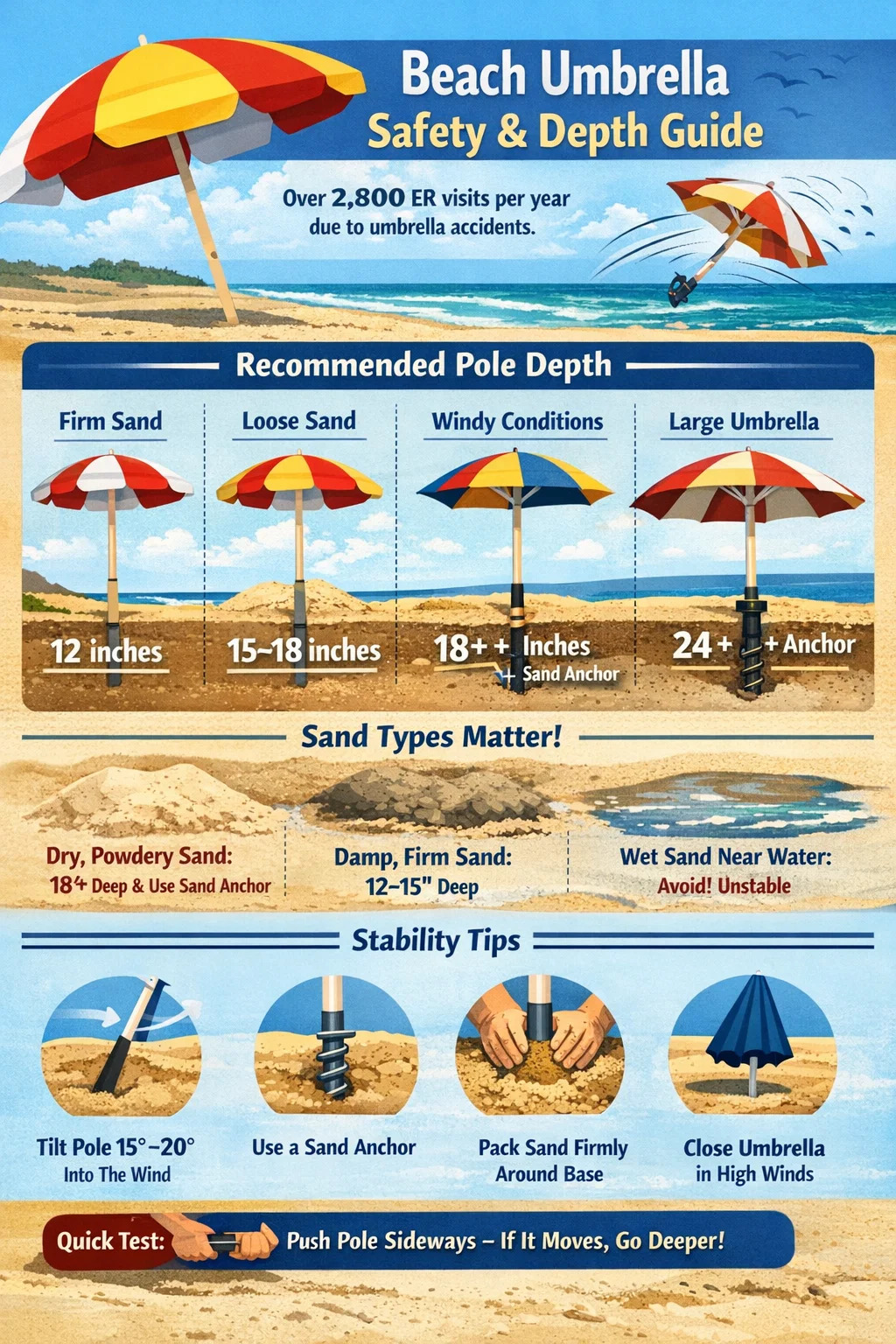 Tá doimhneacht riachtanach ach ní leor é le haghaidh scáth fearthainne trá sábháilte. Cuireann na fachtóirí seo a leanas le cobhsaíocht fhoriomlán mar aon le doimhneacht an ionsáite: