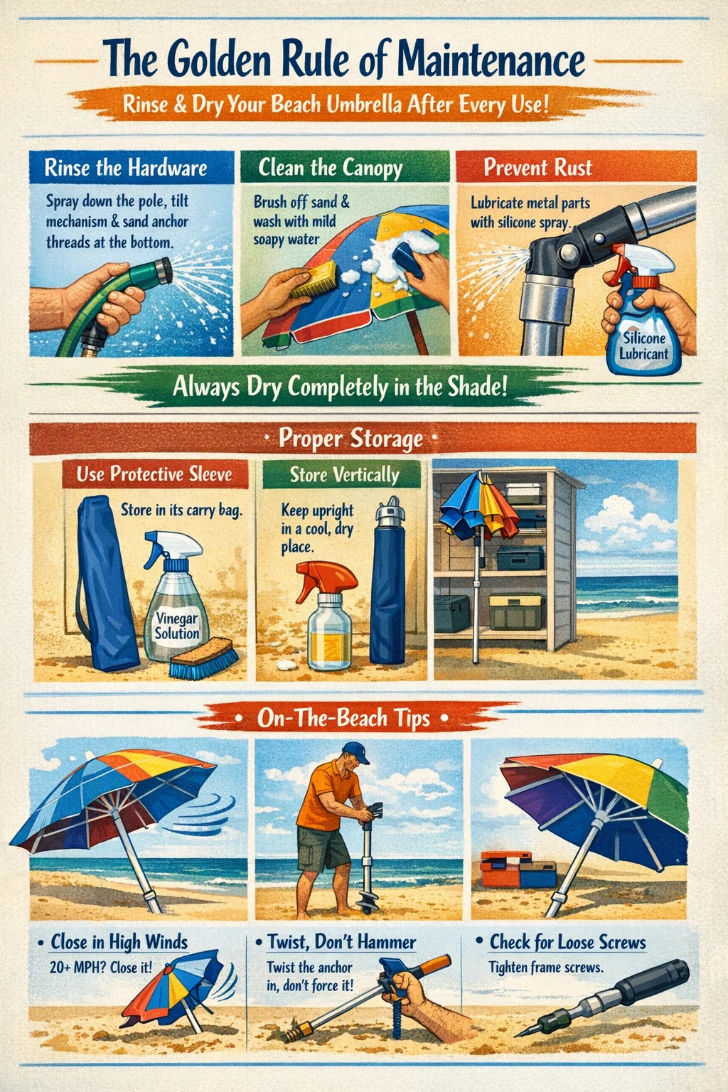 An chéim is tábhachtaí maidir le cothabháil a scáth trá tá go sruthlaigh sé le huisce úr agus tirim go hiomlán é tar éis gach úsáide amháin. Feidhmíonn sáile agus gaineamh mar oibreáin chreimneach a dhíghrádaíonn ailt mhiotail fabraice agus meirge. Trí chúig nóiméad a chaitheamh ag sruthlú do threalamh, is féidir leat a shaolré a leathnú ó shéasúr amháin go dtí os a chionn cúig bliana d'úsáid iontaofa .