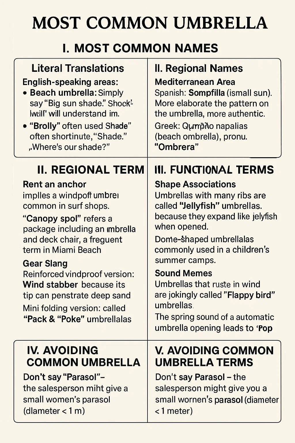 Ná habair "Parasol" - b'fhéidir go dtabharfadh an díoltóir parasól beag ban duit (trastomhas < 1 mhéadar).