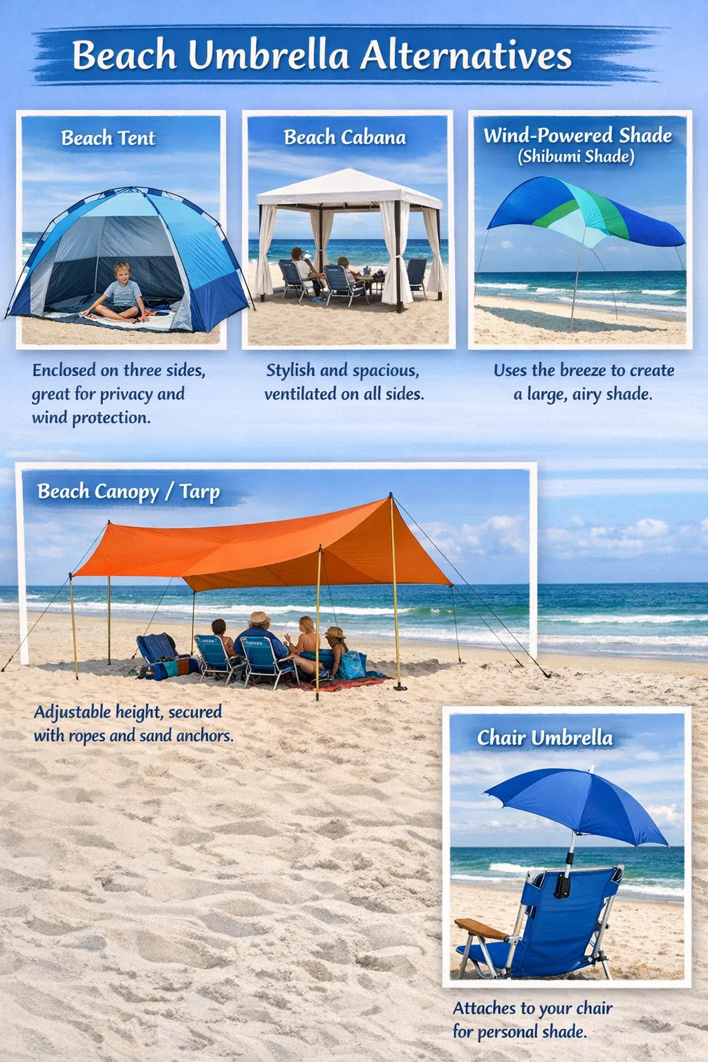 Má cheapann tú go bhfuil sé ró-dheacair scáth fearthainne trá a iompar nó a chur ar bun, nó má bhíonn imní ort faoi bheith séidte ag an ngaoth, tá roghanna eile i bhfad níos cobhsaí le limistéir níos mó scáthaithe ar fáil ar an margadh.
