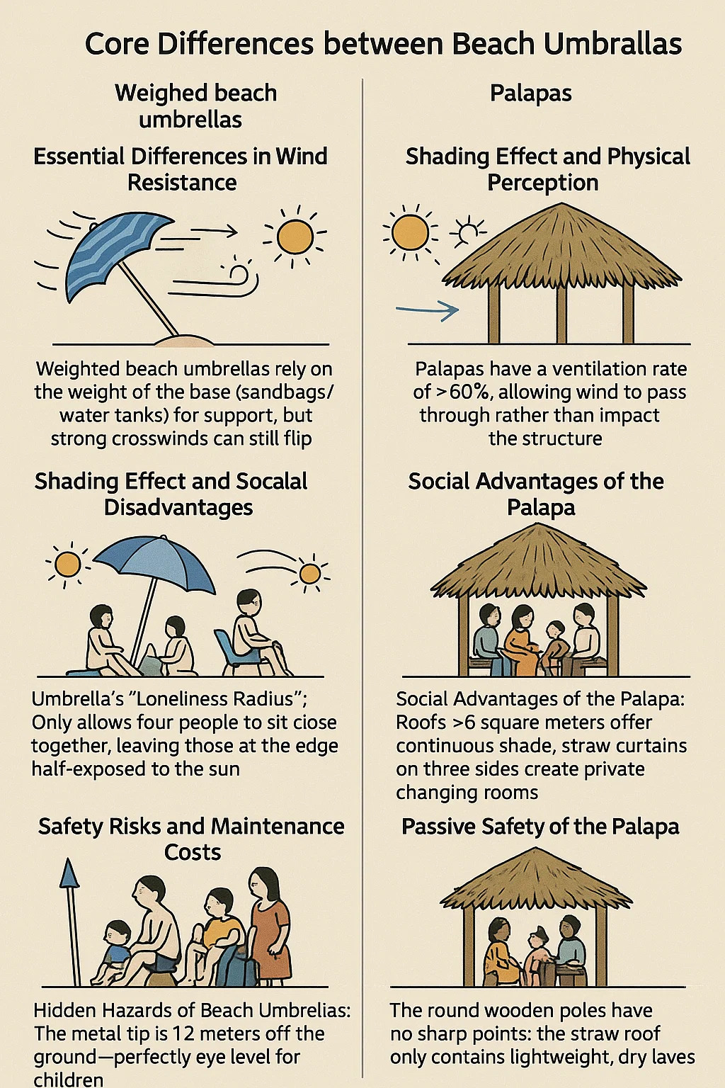 Palapas: Tá ráta aerála de> 60%ag an díon duilleog pailme, rud a ligeann don ghaoth dul tríd an struchtúr seachas tionchar a imirt ar an struchtúr. Déantar colúin tacaíochta a adhlacadh> 1 mhéadar faoi thalamh, agus braitheann friotaíocht na gaoithe ar an mbunús, ní ar an meáchan. Loighic Friotaíochta Gaoithe: Cosúil leis an gcaoi a lúbann bambú sa ghaoth.