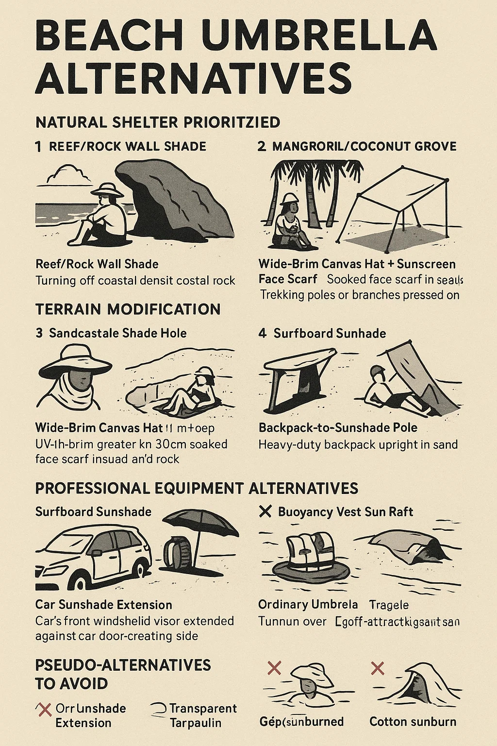 Poll Scáthaigh an Chaisleáin Gainimh: Tochailt clais dhomhain L-chruthach (2m ar fad x 0.8m ar leithead x 1m ar doimhneacht) i limistéar tirim ghainmheach. Cuir sruth-adhmad/cláir surfála trasna barr an chlais agus clúdaigh le duilleoga pailme le haghaidh inslithe. Oiriúnach do: Limistéir nap sealadacha do leanaí.
