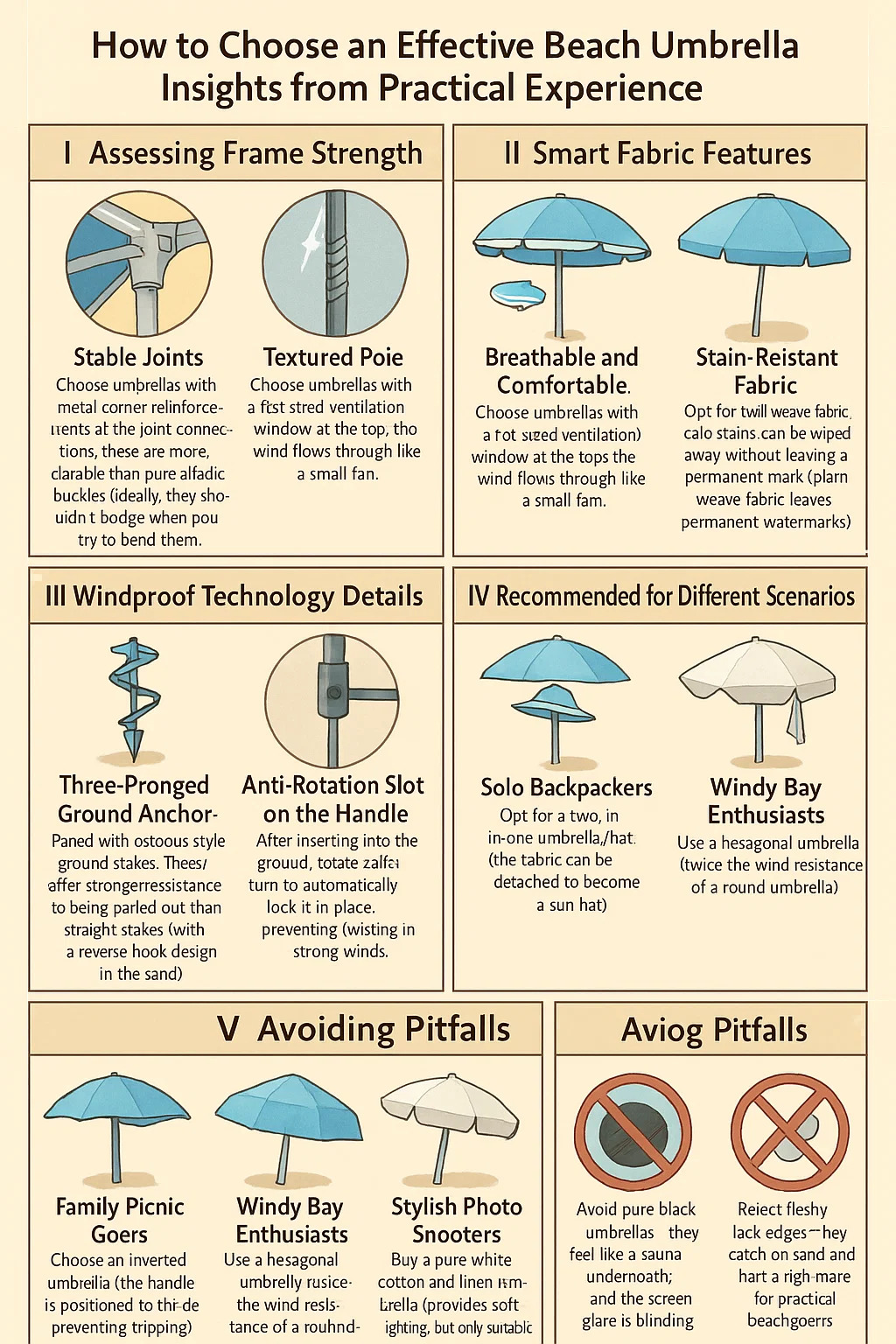 Seo iad na príomhphointí maidir le fíor-éifeachtach a roghnú scáth fearthainne trá , mínithe le taithí phraiticiúil: