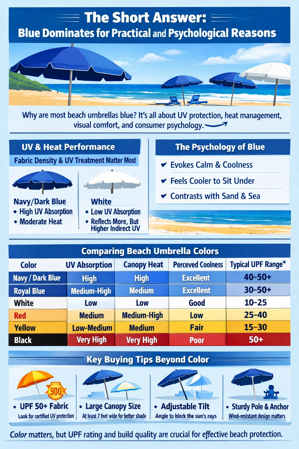 The table illustrates why blue sits in a sweet spot: it offers strong UV absorption without the psychological and thermal downsides of black, and it delivers a perception of coolness that neither red nor yellow can match in a beach setting.